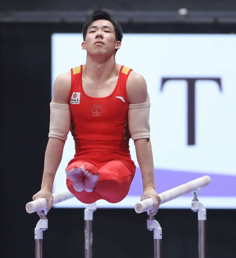 10月19日,中国选手张博恒在男子资格赛双杠项目比赛中。新华社记者 杜潇逸 摄