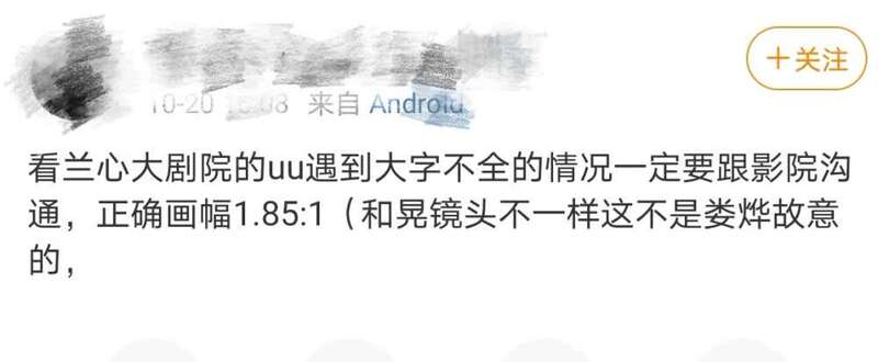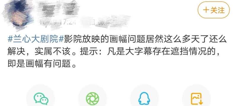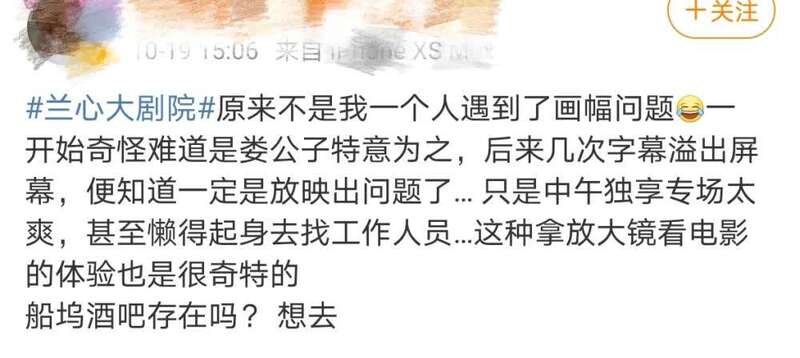 通常,影片顶部不会有关键信息,即便被切割了,观众可能也不会察觉。但《兰心大剧院》左侧字幕直接顶天,显示不全就很容易被发现。“我平时喜欢看艺术影展,常会有一些特殊画幅的片子,比如老电影一般都是1.37:1画幅,接近正方形画面,画面左右会有黑边。”《兰心大剧院》放映结束后,艾小姐和其他观众一起向影院经理反映显示不全的问题,对方无奈表示,因为担心画面上“留黑边”影响观影体验,平时都是这样放映的。但作为观众而言,相比放映时看到黑边,她更在意画面信息是否显示完整。