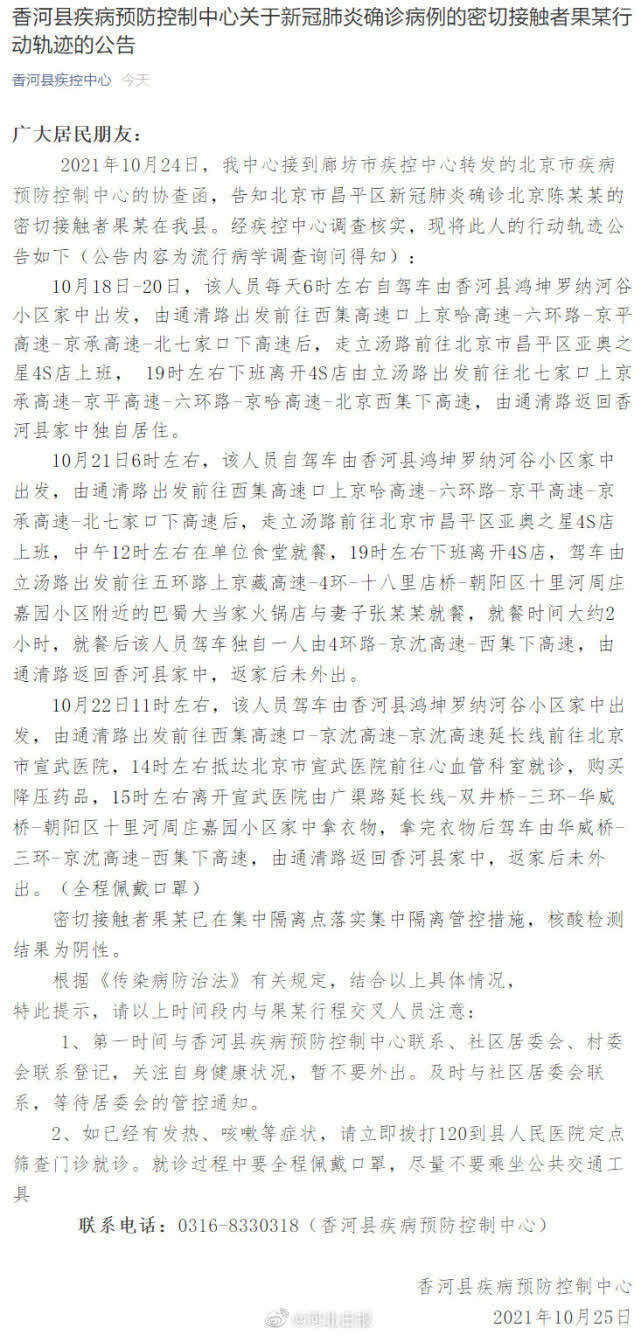 2021年10月24日,我中心接到廊坊市疾控中心转发的北京市疾病预防控制中心的协查函,告知北京市昌平区新冠肺炎确诊北京陈某某的密切接触者果某在我县。经疾控中心调查核实,现将此人的行动轨迹公告如下(公告内容为流行病学调查询问得知):
