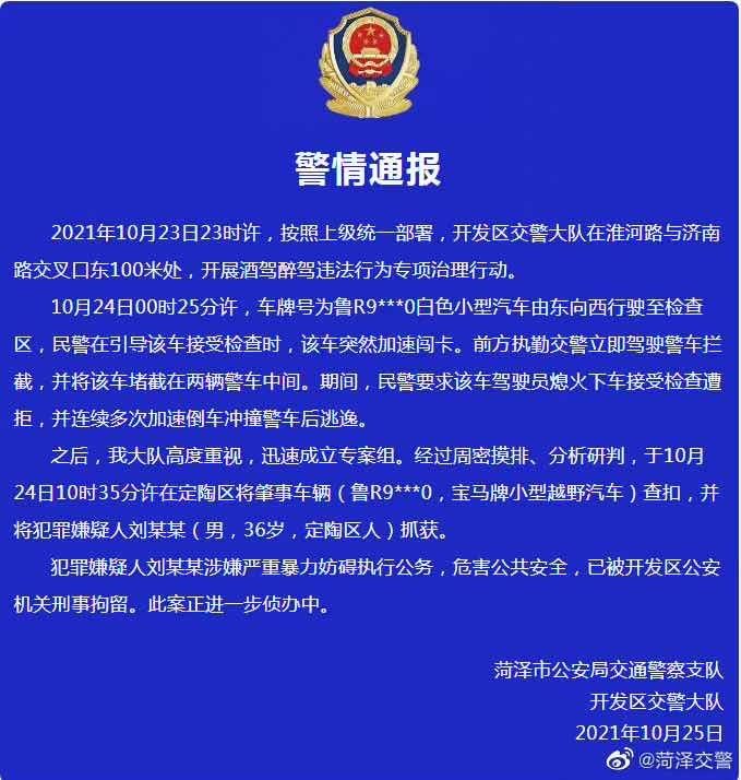 山东菏泽一宝马驾驶员闯卡并多次加速倒车冲撞警车被刑拘