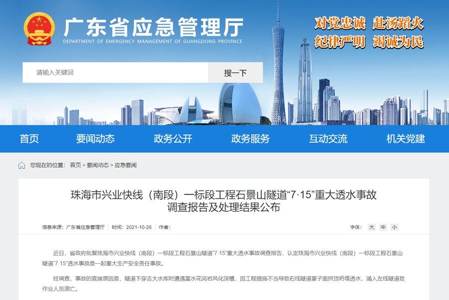 近日,广东省政府批复珠海市兴业快线(南段)一标段工程石景山隧道“7·15”重大透水事故调查报告,认定珠海市兴业快线(南段)一标段工程石景山隧道“7·15”透水事故是一起重大生产安全责任事故。