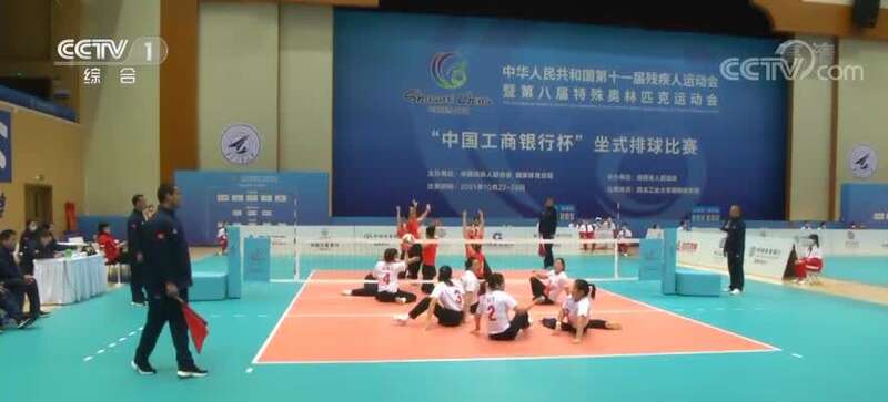 这是本届残特奥会女子坐式排球项目中,江苏队与东道主陕西队半决赛中的一幕。每赢一分,就带领队友用这样独特方式庆祝的8号队员叫唐雪梅,球队的场上队长。