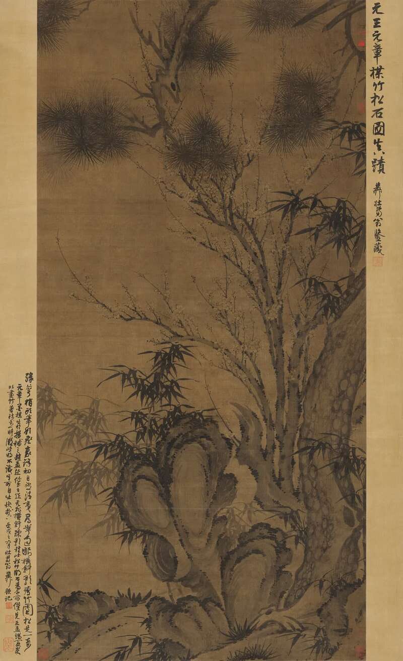 《梅竹松石图》,被谢稚柳认为是王冕传世的唯一松竹湖石题材,“传世之作无非横斜疏影,惟此松竹湖石为世所仅见”。