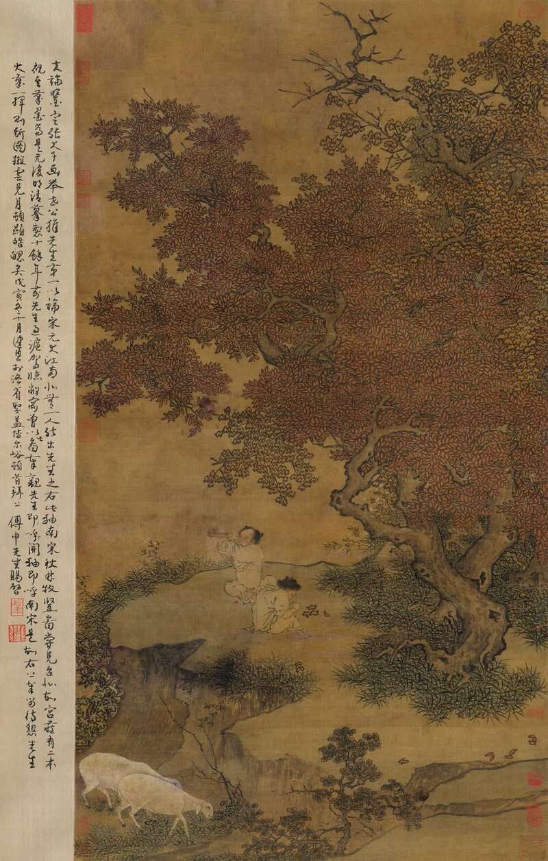 宋画中对于儿童的描绘是历代最为丰富的,出现了诸多擅画儿童的画家。《秋林牧童图》描绘的是两小儿于田野间坡石处嬉戏玩耍的场景, 画面右下部两只正在觅食的山羊,也增添了田园气氛。