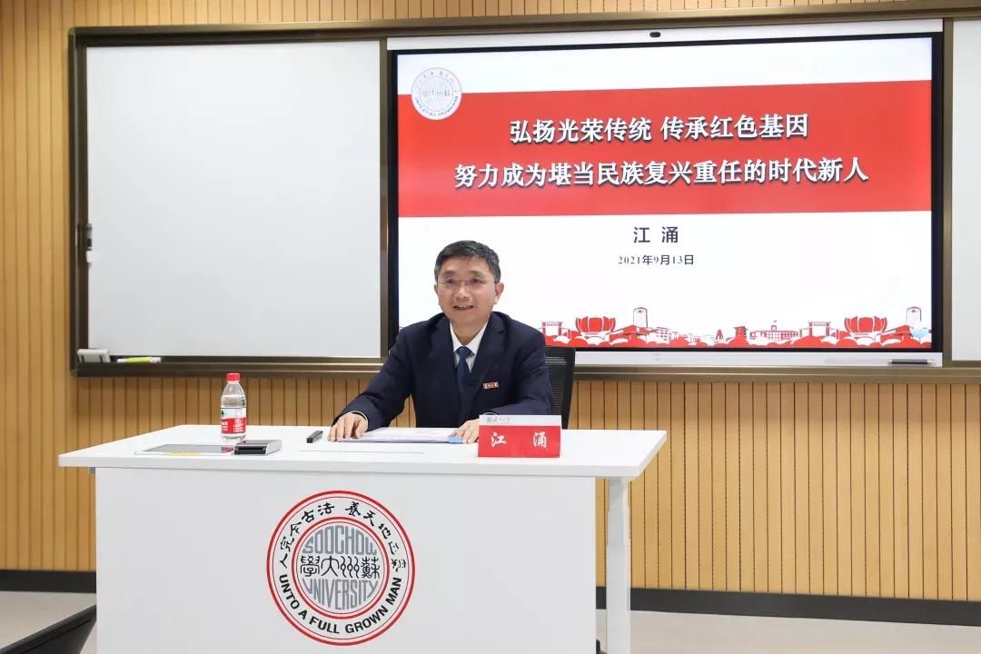 校党委书记江涌以“弘扬光荣传统 传承红色基因 努力成为堪当民族复兴重任的时代新人”为题,以大学是什么、苏州大学是一所怎样的大学、怎么读大学为切入点,为新生带来了一堂生动的“大学第一课”。