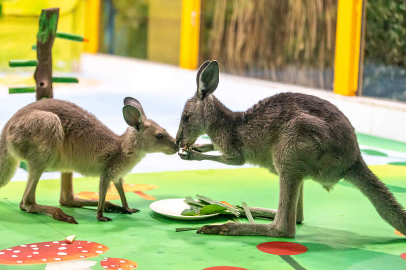 东部灰袋鼠变身“吃货”,享用保育员制作的美食。