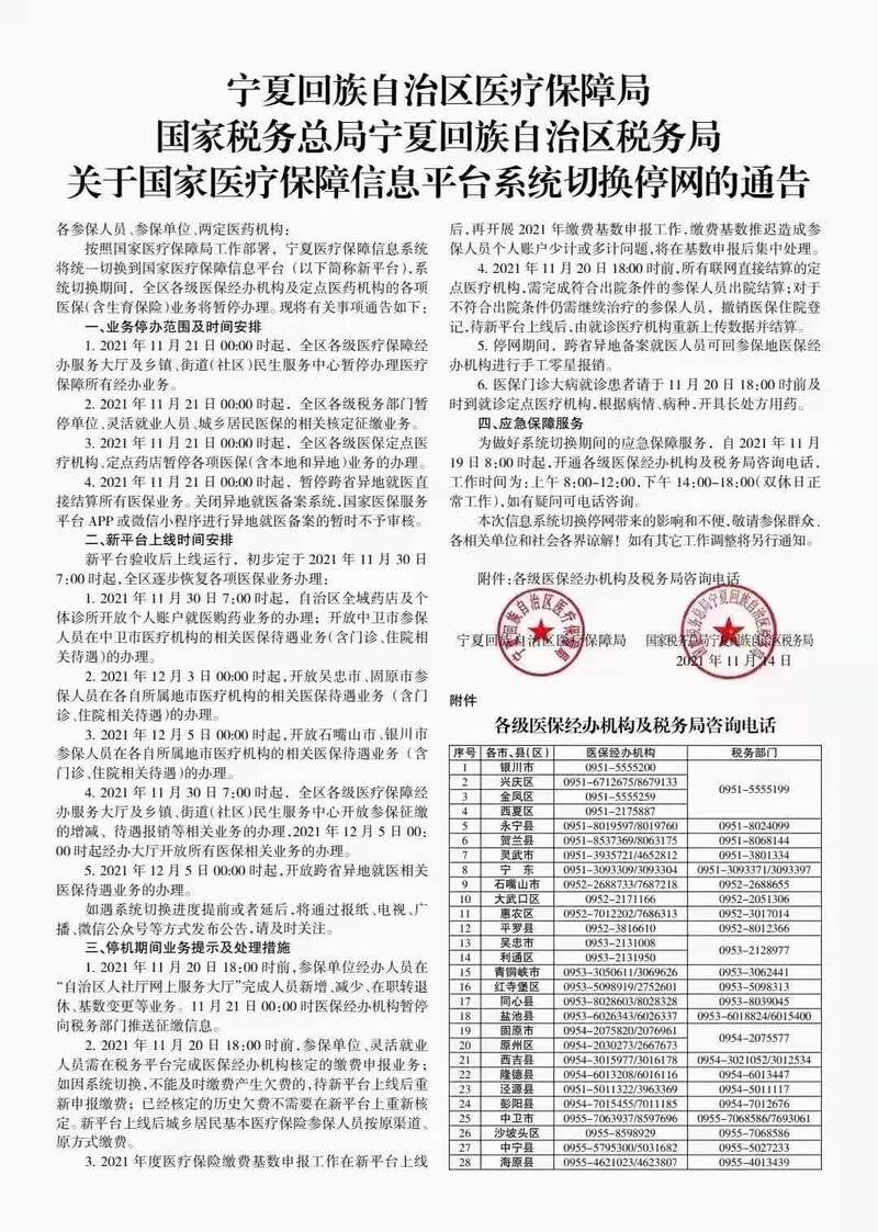 11月15日,宁夏回族自治区医疗保障局和宁夏税务局发布通告,按照国家医疗保障局工作部署,宁夏医疗保障信息系统将统一切换到国家医疗保障信息平台,系统切换期间,全区各级医保经办机构及定点医药机构的各项医保(含生育保险)业务将暂停办理。