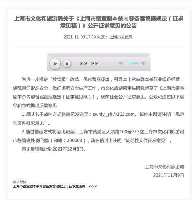 中新网北京11月17日电 (宫宏宇 左雨晴)日前,上海市文化旅游局牵头起草了《上海市密室剧本杀内容备案管理规定(征求意见稿)》,向社会公开征求意见。