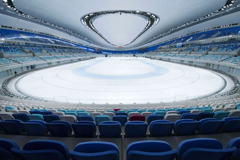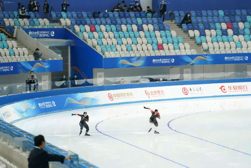 速度滑冰运动员在“冰丝带”的测试活动中。新华社记者鞠焕宗摄