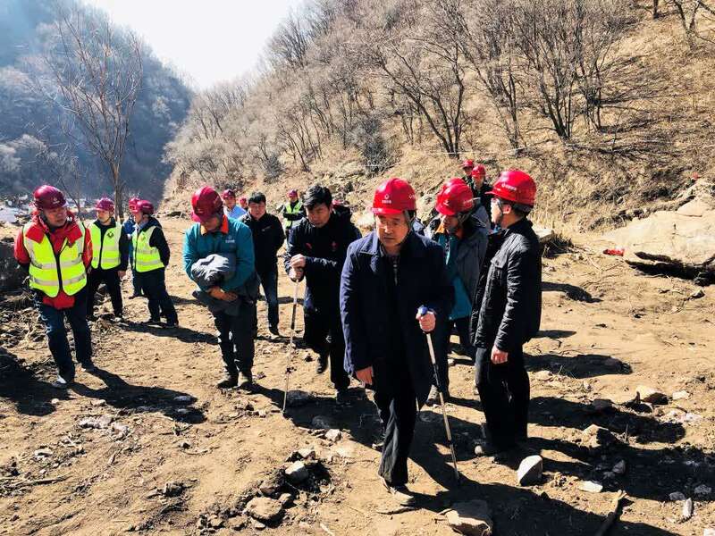 北京城建集团党委书记、董事长陈代华(前)勘察国家高山滑雪中心工程现场(2018年3月9日拍摄于小海陀山)。北京城建集团提供