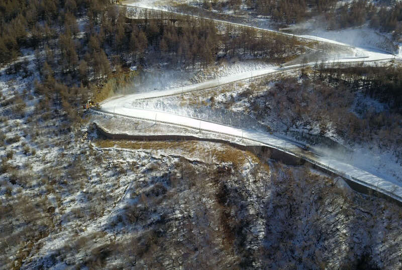 这是11月16日拍摄的正在造雪中的国家高山滑雪中心雪道(无人机照片)。新华社记者张晨霖摄