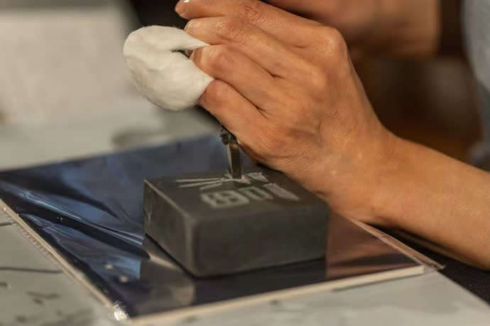 “‘上墨’最难的就是要保持墨色均匀,深色或浅色都是可以的,但要保持整体一致。”真正操作起来,才知道张品芳这句“墨色均匀”需要怎样的功夫。墨蘸多了、手劲稍大,都会在纸上留下一个漆黑的大墨点,破坏整体墨色。半个多小时过去,每个体验者面前都是一张斑驳的拓片。