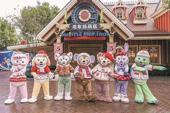 玲娜贝儿(左一)与其所在的达菲家族换上最新的冬日服装卖萌迎客