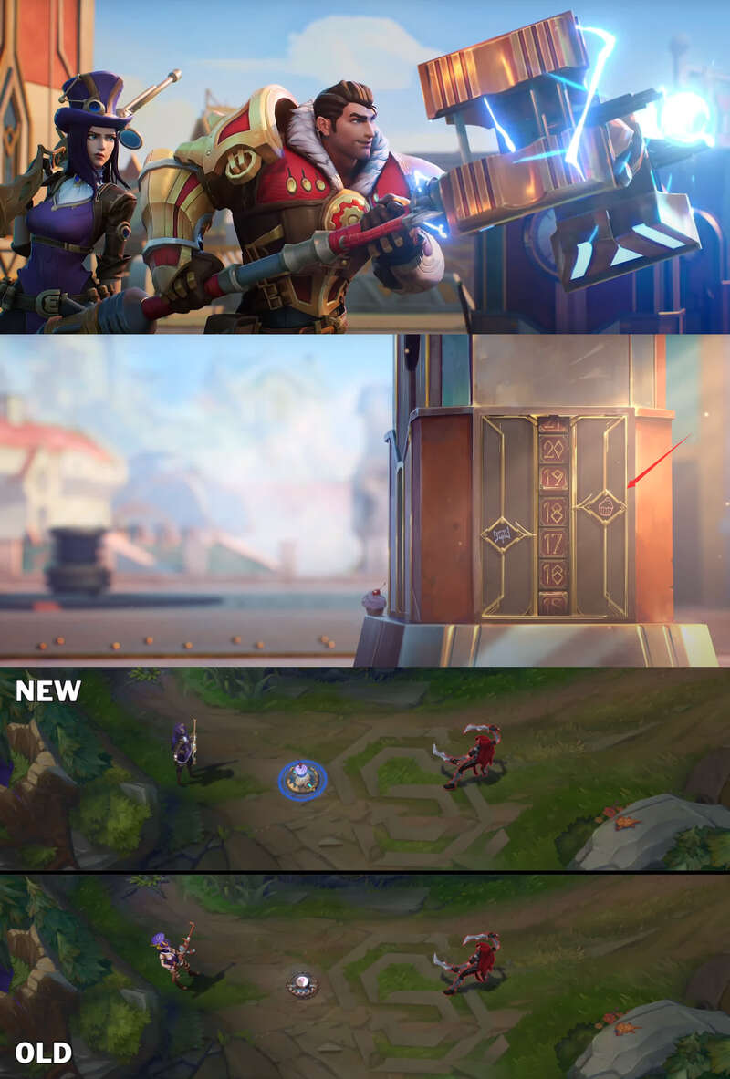 对立结构也同时出现双线叙事上。一面是上城里杰斯进行的秘密符文实验,最终制造出了魔法与机械合体的海克斯科技(也是游戏中的设定);另一边是符文的失窃导致的下城祖安中动荡变故,催生了“微光”生物科技。这两条背景故事相互影响,塑造了这些人物群像。