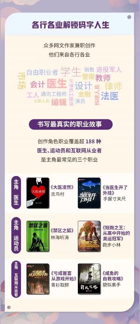 因此,丰满、生动的职业角色在网文故事中接连诞生。三百六十行,行行都有故事。迄今为止,网文作家创作角色覆盖的职业超188种,其中,医生、运动员和互联网从业者是被创作得最多的三个职业,也是职业文主角最常见的职业。