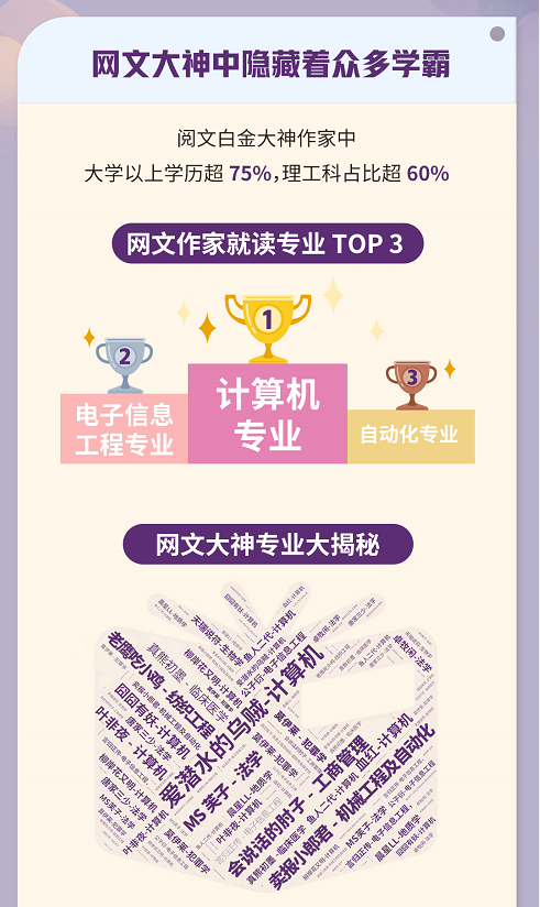 不少“学霸”隐藏在网文作家中,他们结合自己的专业背景和职业经历,创作了系列“硬核”故事。《画像》显示,阅文白金、大神作家中,大学以上学历超75%,理工科占比达60%。以文字为生的网文作家,计算机专业、电子信息工程专业、自动化专业是他们就读专业TOP3。知名作家如爱潜水的乌贼、囧囧有妖、血红和叶非夜,均是计算机专业出身,公子衍和言归正传皆为电子信息工程专业。