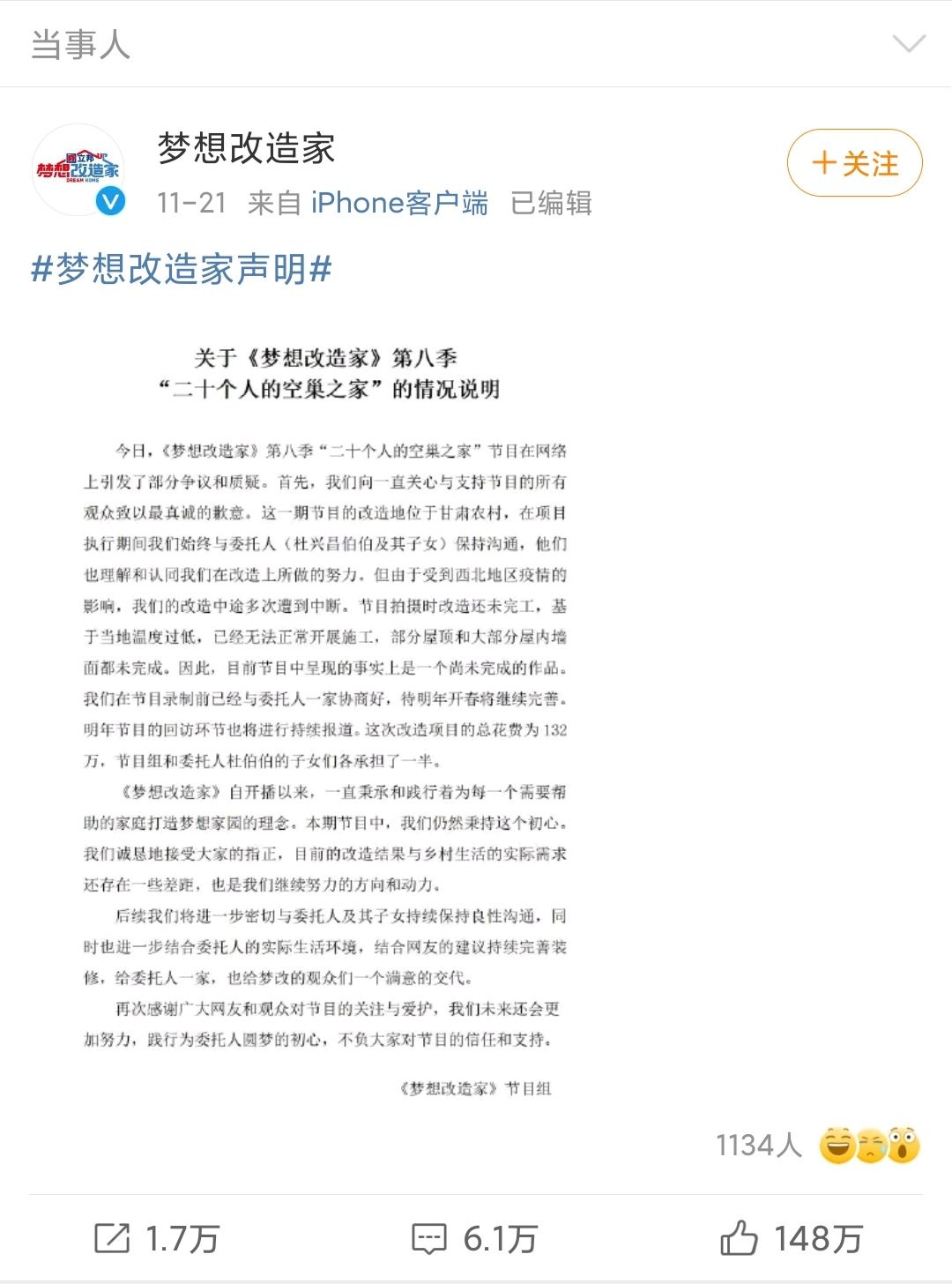 在引发热议后,《梦想改造家》节目组表示,由于疫情等原因,节目拍摄时改造还未完工。由于当地温度过低,节目组已与委托人一家协商好,待明年开春后继续完善。希望经历这一次舆情风波后,设计团队能以开放、包容的心态正视网友的建议,在深入了解用户真实需求的基础上进行完善,让杜老伯一家住进舒适、宜居的温馨之家。