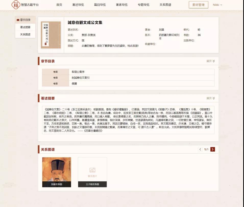 读者点击智慧古籍平台首页的“著述导览”页面,便可查阅著述的章节目录、著述提要等基本信息及相关作者的世系图、社会关系图。