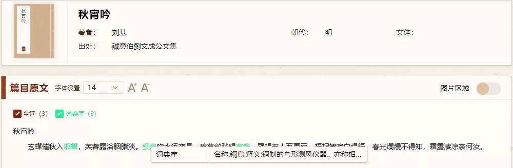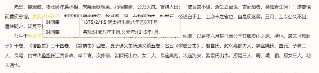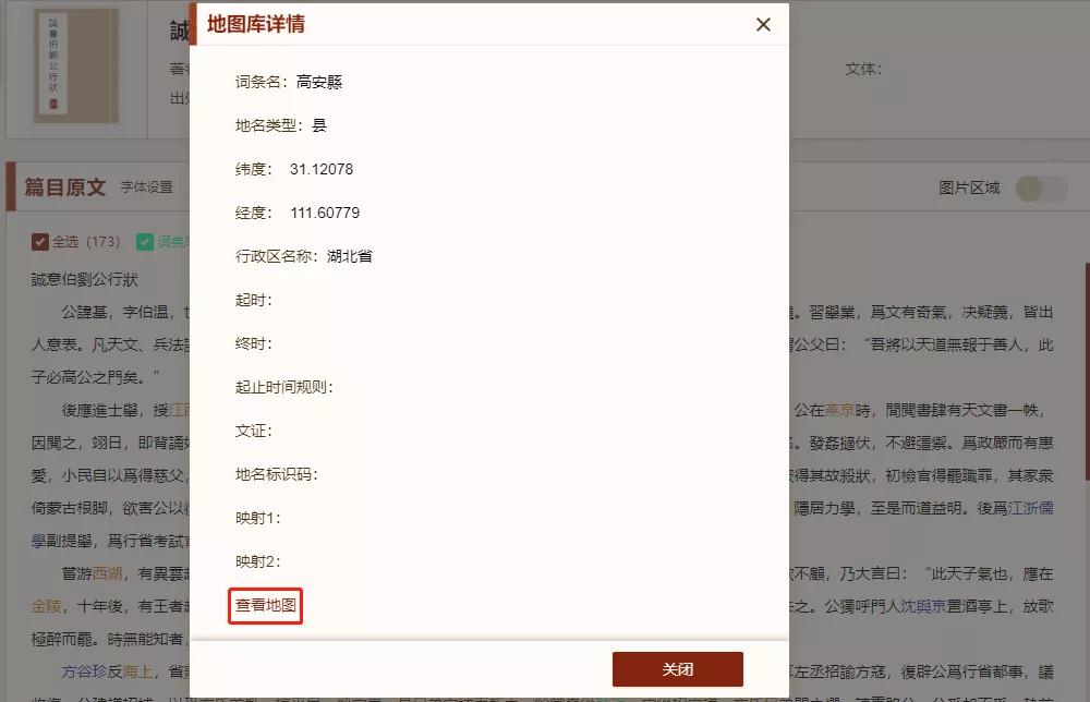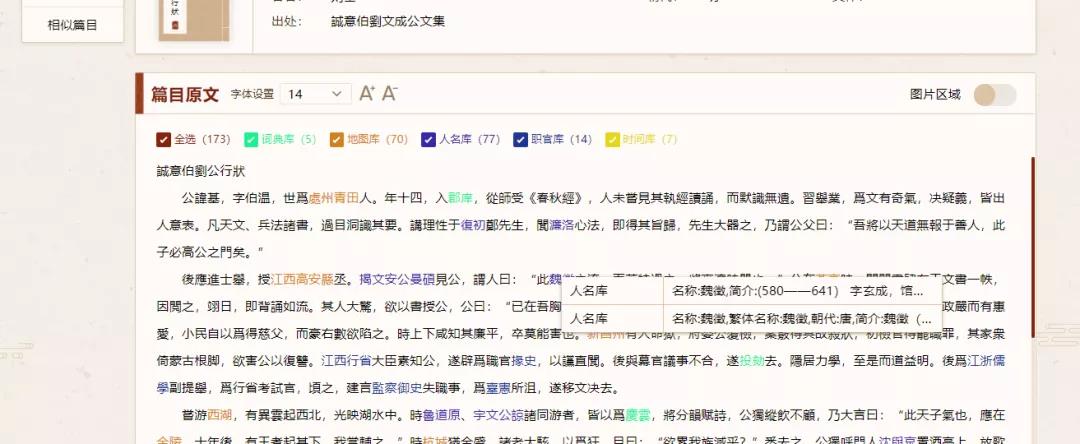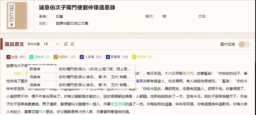 3.智能标引:利用了结构化的地名、人名、职官、词典等数据库对上传的文本进行批量标引,从而使文本与后台的数据产生了关联。读者在平台点击已标引的字词即可查看释义。