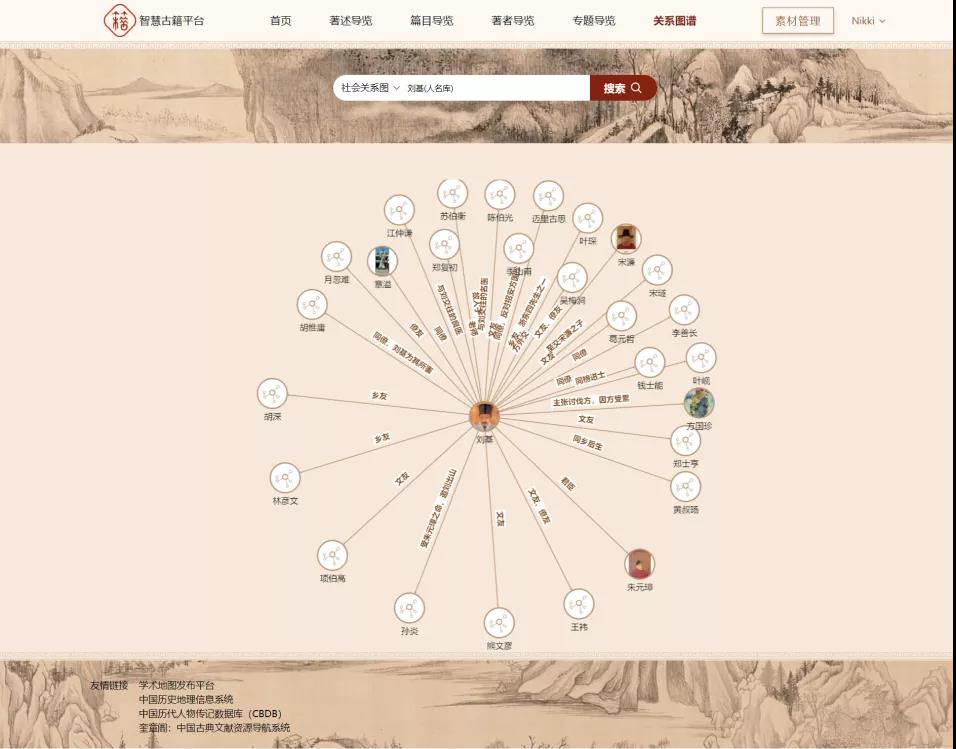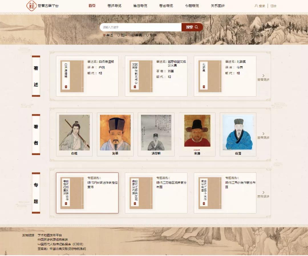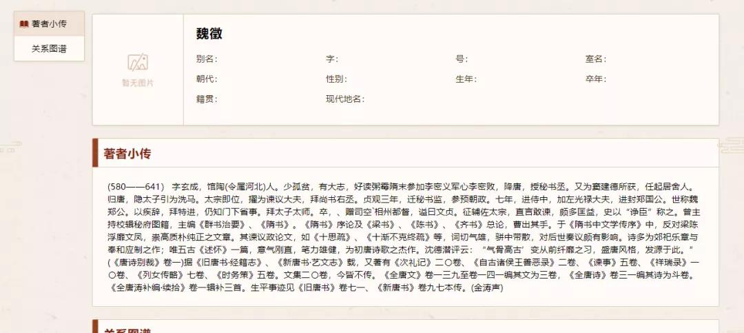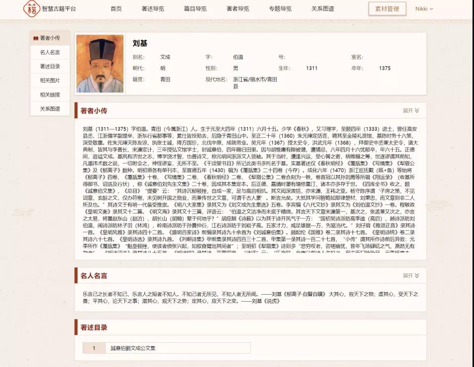 读者点击智慧古籍平台首页的著者导览,即可查阅该人物的小传、名言、著述目录、人物行迹、世系图及社会网络关系图。