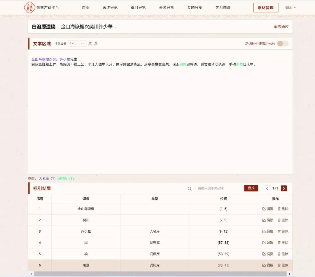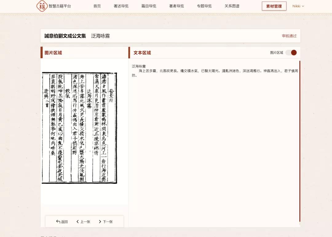 上传到“智慧古籍平台”的文献资料将经过OCR识别、机器标点、人工校对、专家审核、机器标引、标引审核,然后在前台发布。