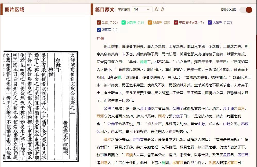 点击“篇目导览”即可进入文本阅读界面。文本阅读是本平台的特色功能。首先,为提高文本的真实性和准确性,本平台提供了古籍图片与古籍数字化文本一一对应的功能。