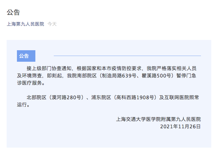 中国青年报客户端上海11月26日电(中青报·中青网记者王烨捷)记者刚刚从上海市第九人民医院获悉,该院接上级部门协查通知,即刻起暂停门急诊医疗服务,互联网医院照常运行。