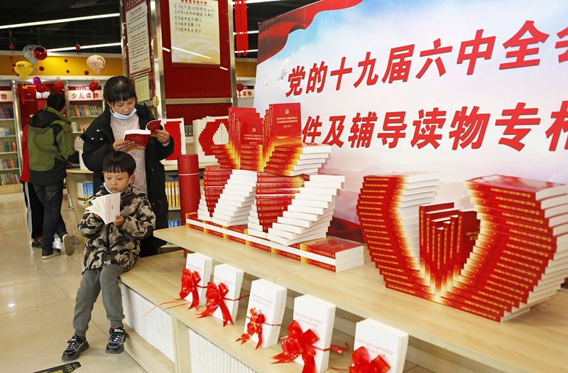 2021年11月25日,在山西省临汾市襄汾县新华书店,读者在选购党的十九届六中全会文件和辅导读物。