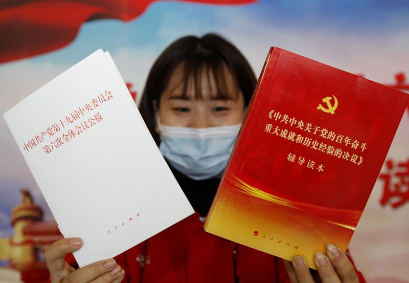 2021年11月25日,在山西省临汾市襄汾县新华书店,工作人员在向读者展示党的十九届六中全会文件和辅导读物。