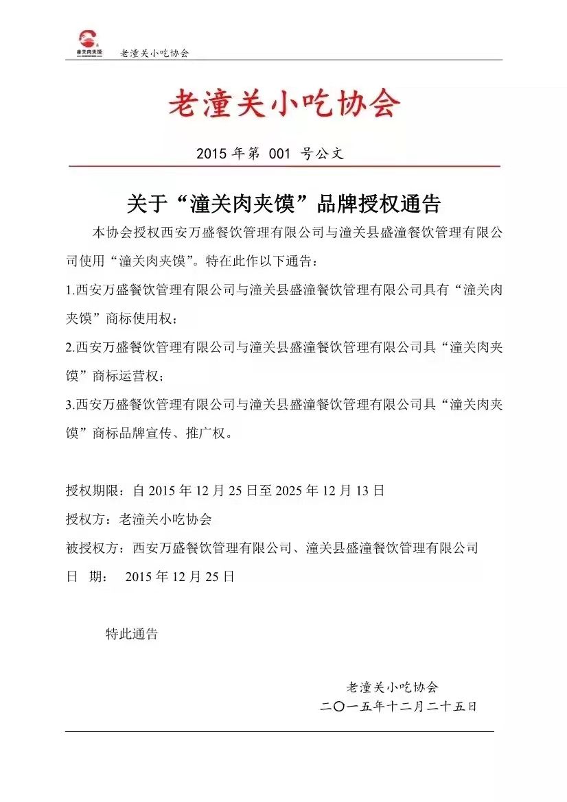 “潼关肉夹馍协会”的官方微信公号“潼关肉夹馍”文章披露,2015年12月25日,老潼关小吃协会将“潼关肉夹馍”品牌授权给“西安万盛餐饮管理有限公司”与“潼关县盛潼餐饮管理有限公司”两家公司,进行该商标的使用、运营。