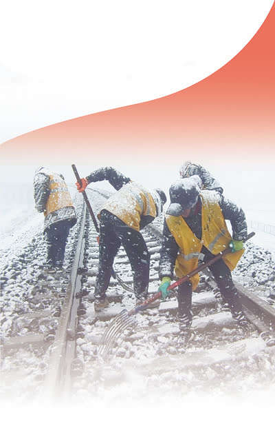 中国铁路青藏集团公司职工冒雪对整修后的道床进行清理。马祎俊摄