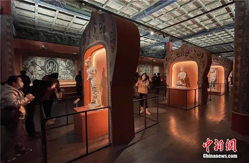 2021年11月,观众在北京故宫博物院的“敦行故远:故宫敦煌特展”上欣赏莫高窟佛像的复制展品。中新社记者 侯宇 摄