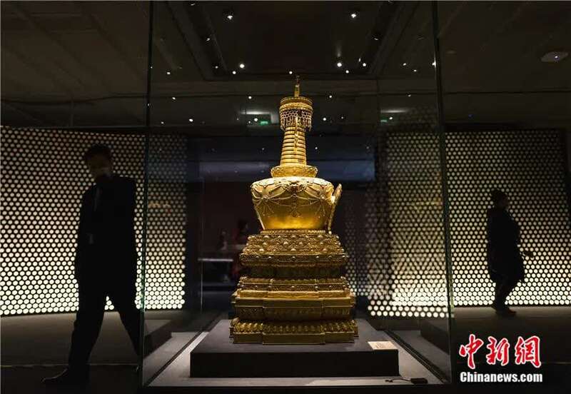 2020年12月,“妙宝庄严——故宫博物院藏法器展”在北京嘉德艺术中心开展。图为“乾隆款铜镀金嵌松石佛塔”展品。中新社记者 侯宇 摄