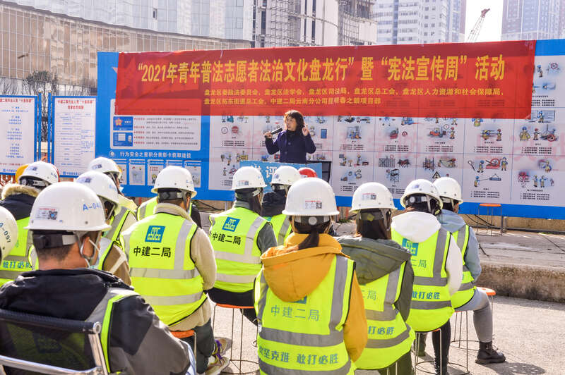 12月4日是第八个国家宪法日,也是第四个“宪法宣传周”。作为 “我为青年做实事”的一项实践活动,中建二局云南分公司团委联合昆明市盘龙区委政法委员会、盘龙区司法局等单位,组织法律专业人士,前往中建二局云南分公司昆明春之眼项目工地,为一线工人开展讲座,用简洁易懂的语言和实际案例向工人们解读《宪法》《民法典》的内容,让农民工进一步掌握签订劳动合同时需注意的事项、劳动报酬被拖欠问题、工伤损害赔偿以及救济途径等相关法律知识。