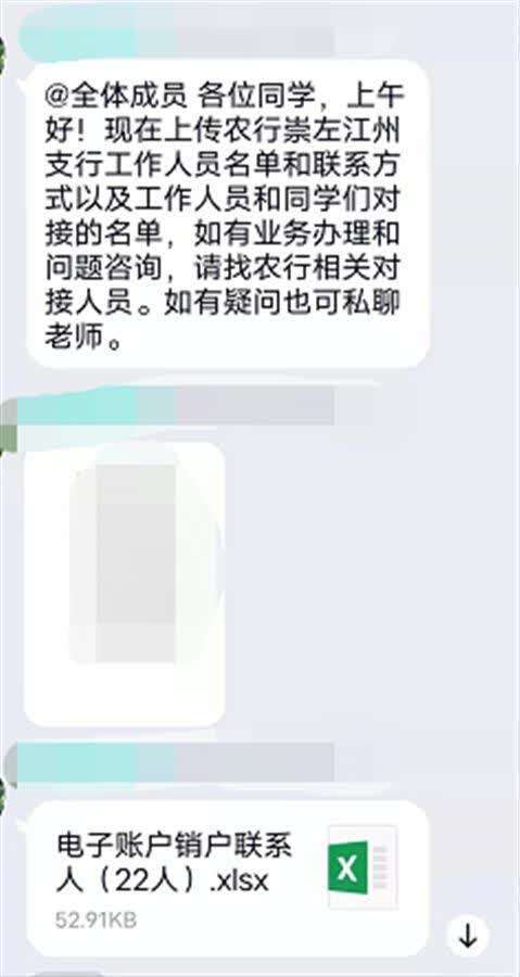 接到情况反映后,学校老师在群聊内回复称,学校已组织会议,正在跟进解决此事,并在群内上传了一份疑似由银行发布的《Ⅱ、Ⅲ类电子账户说明》。