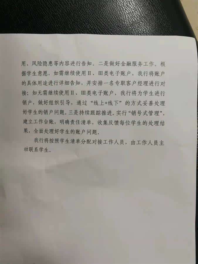 文件对“学生使用Ⅱ、Ⅲ类电子账户体验不佳事宜”作出说明,称Ⅱ、Ⅲ类电子账户不影响个人资金安全和个人征信,也不影响柜面业务及网络金融业务的办理。之后,银行将为“被开账户”的学生提供专人指导服务,“一对一”对接处理账户问题。