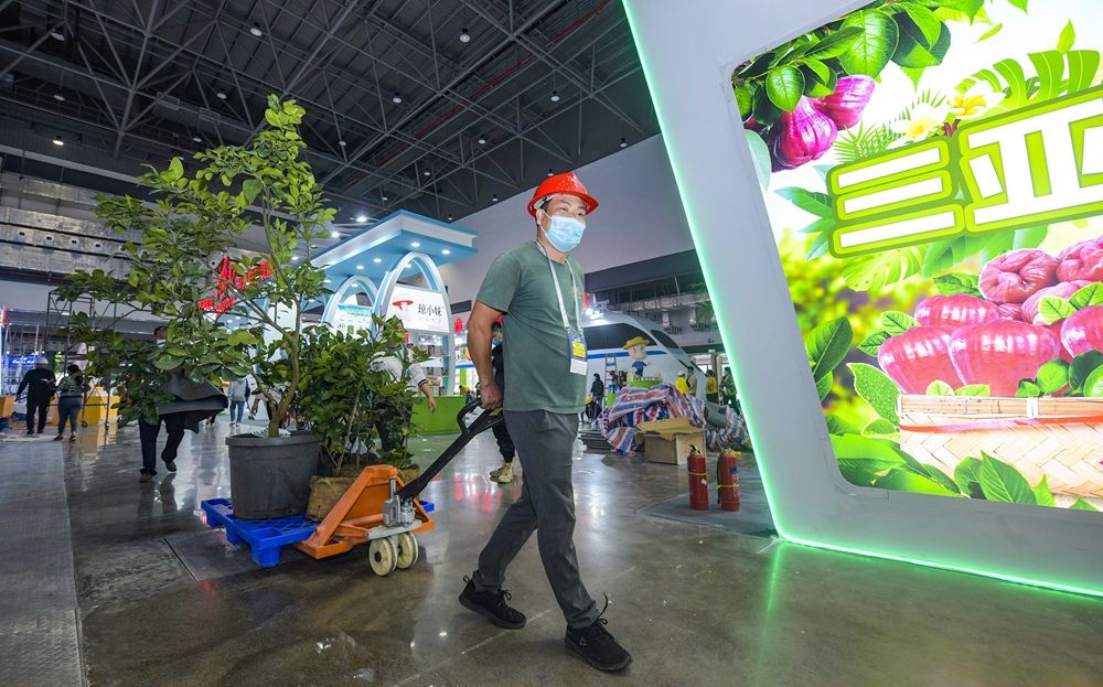 2021年12月15日,2021年中国(海南)国际热带农产品冬季交易会已开始进入倒计时。冬交会展馆内工作人员在紧张有序地布展。目前,不少展位已经布展完成,静等冬交会开幕。