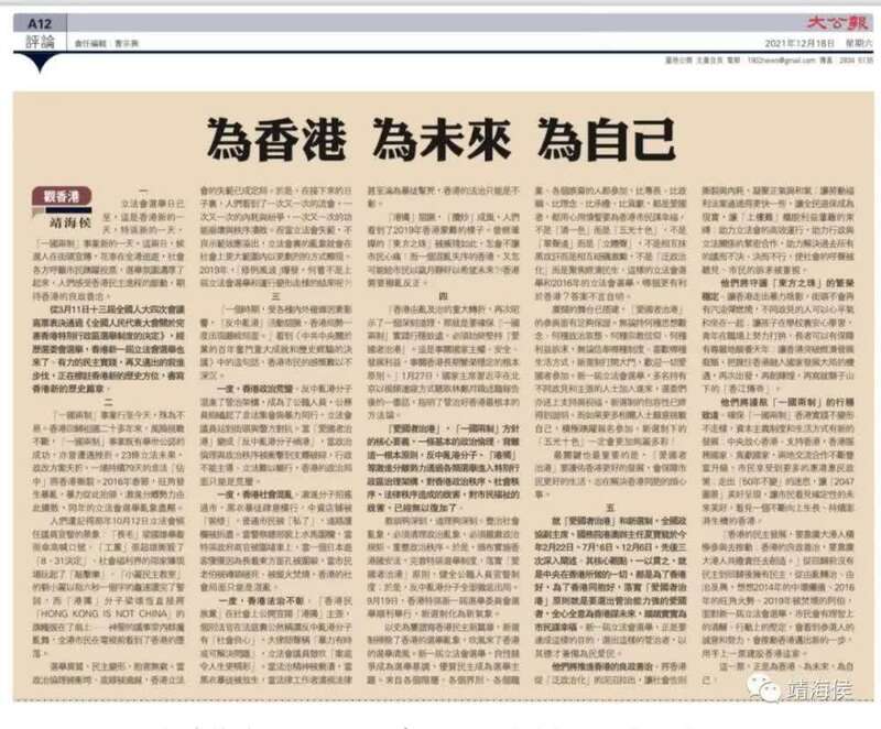 12月18日,香港《大公报》刊发“靖海侯”专栏评论文章,半个版,3000多字,剖解此事宜。全文主题,一言以蔽之,就是观照现实与未来,让中央完善香港选举制度的初心走远,使市民可以憧憬将至的美好明天。