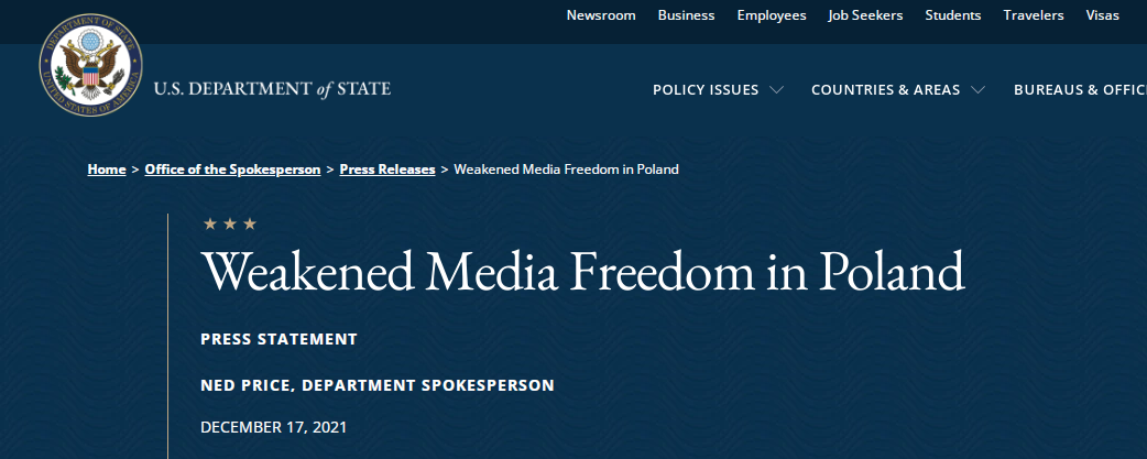 美国国务院还“提醒”波兰政府:“自由和独立的媒体加强了我们的民主,使跨大西洋联盟更具弹性,巩固了我们的双边关系。我们期待和波兰政府在民主价值观和尊重资本自由的基础上推进我们的优先事项。现在是同盟国团结一致的时候了。”