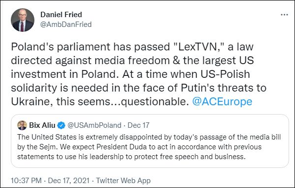 这条推文被前美国驻波兰大使丹尼尔·弗里德(Daniel Fried)转发,后者带着一丝威胁称,波兰议会通过这项限制TVN的法案,不仅仅是“反对媒体自由”,还涉及“美国在波兰的最大投资”。“面对普京对乌克兰的威胁,美国和波兰需要团结起来,但这似乎……值得怀疑。”