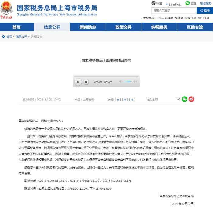 为进一步营造依法诚信纳税的良好环境,请此前尚未关注自身涉税问题或自查整改不到位的明星艺人、网络主播等,抓紧对照税法及有关通知要求进行自查,并于2021年底前向税务部门主动报告和纠正涉税问题,税务部门将依通知要求从轻、减轻或者免予税务处罚。对仍拒不自查自纠或者自查自纠不彻底的,税务部门将依法依规严肃处理。