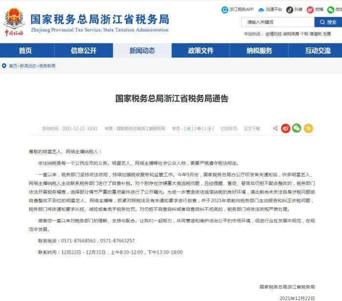 中新网12月22日电 22日,国家税务总局上海市税务局、国家税务总局浙江省税务局分别发布通告称,依法纳税是每一个公民应尽的义务。明星艺人、网络主播等社会公众人物,更要严格遵守税法规定。