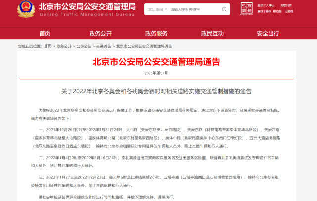 关于2022年北京冬奥会和冬残奥会赛时对相关道路实施交通管制措施的通告