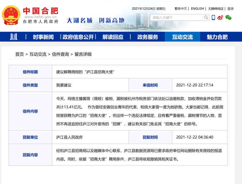 当红主播黄薇(薇娅)偷逃税款的行为造成了恶劣的社会影响。继12月21日被中国网络社会组织联合会取消网络诚信宣传大使称号后,她的又一称号将被取消。而这一称号是她的家乡安徽省庐江县在今年初刚刚授予的。澎湃新闻记者从相关人士处获悉,近日,安徽网友田小姐通过合肥市人民政府官网“12345政务服务便民热线直通车”栏目提出解聘薇娅的“庐江县招商大使”的建议,并于12月22日收到了庐江县人民政府的回复。田小姐在建议中表示,网络主播黄薇(薇娅)偷税、漏税被杭州市税务部门依法处以追缴税款、加收滞纳金并处罚款共计13.41亿元。作为曾经安徽创业青年的代表,相信大家曾一度为她骄傲。大家也都记得,此前薇娅曾获聘为庐江的“招商大使”。但这样一个违反法律规定,且有着严重偷税、漏税情节的人物,显然不再适宜担任庐江对外宣传的“招牌”,建议有关部门免去其“招商大使”的称号。根据田小姐提供的(信件编号211221018801034)的12345留言,庐江县人民政府回复:经和庐江县招商局以及融媒体中心联系,庐江县数据资源局已要求政府单位网站删除有关薇娅的报道内容。同时,依据“招商大使”聘用条件,庐江县将依规撤销其相关证书。