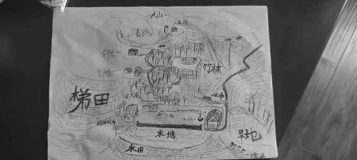 在这份手绘图中,他的家附近有学校、公路、水塘、水田、梯田、旱地、竹林、水牛、广柑等。李景伟表示,当地有种疑似沙葛的白色圆形地瓜,剥掉皮生吃很甜。山上还有毛竹、竹笋。家里有石磨,堂屋最里边靠左有一个丁字形木架上用绳子吊着推磨,“记忆中没见过下雪,当地有人养大批的鸭子。”