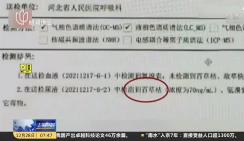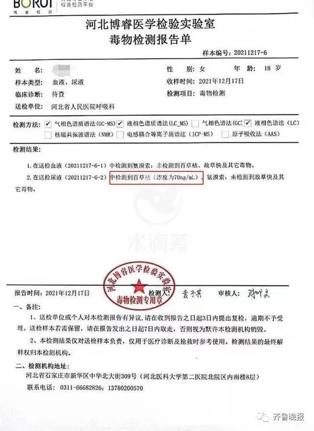 此外,河北博睿医学检验实验室12月17日出具的检测报告单显示,在萌萌的送检尿液中检测到百草枯(浓度为70ng/ml)、氨溴索。