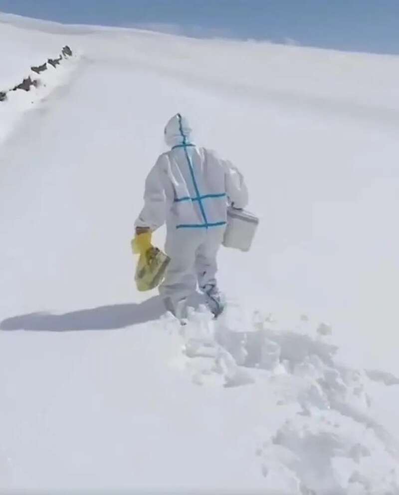 这是新疆乌恰县一名医护人员 冒着大雪, 给护边员做核酸检测。 在茫茫雪地中, 趟出一条路, 孤寂的背影令人动容。