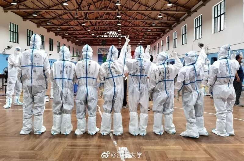 盛夏,南京疫情。 江苏大学611名师生志愿者 在两个小时内集结完毕, 连夜奔赴防疫一线。 酷暑中穿着密不透风的防护服, 他们在汗水中淬炼和成长。
