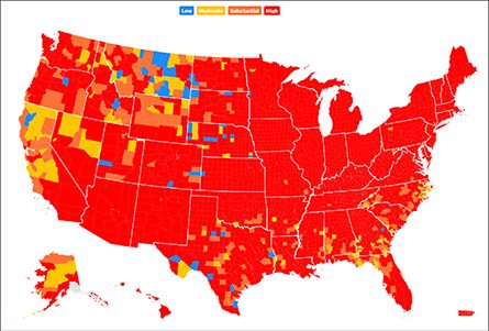 美国疫情地图:85.35%县市为高传播地区,每十万人确诊数超百例