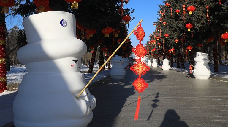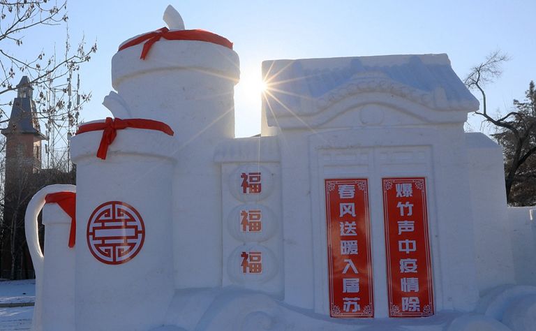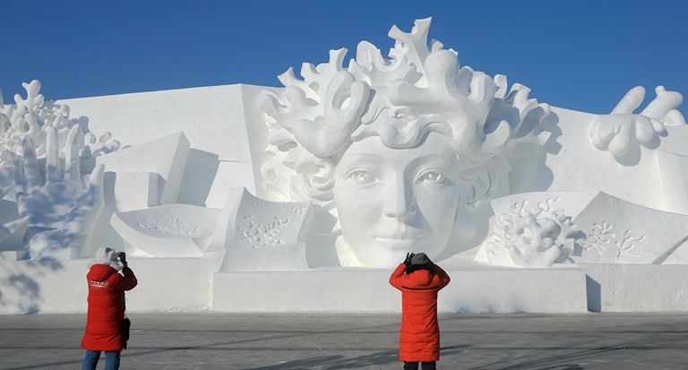 12月29日,哈尔滨,第34届太阳岛雪博会大型主塑《冬奥·太阳岛之旅》正式落成。